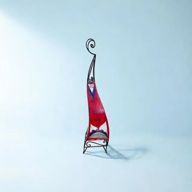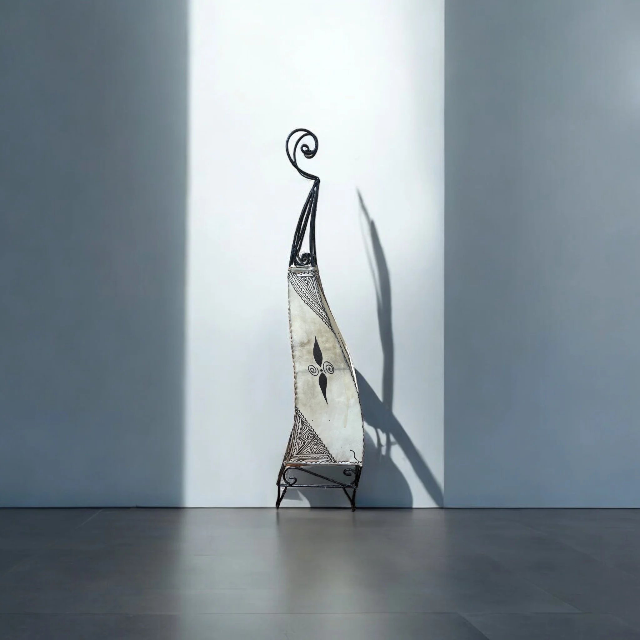 The material of a Moroccan lamp is typically goat skin. These pieces are hand-painted using henna dyes.