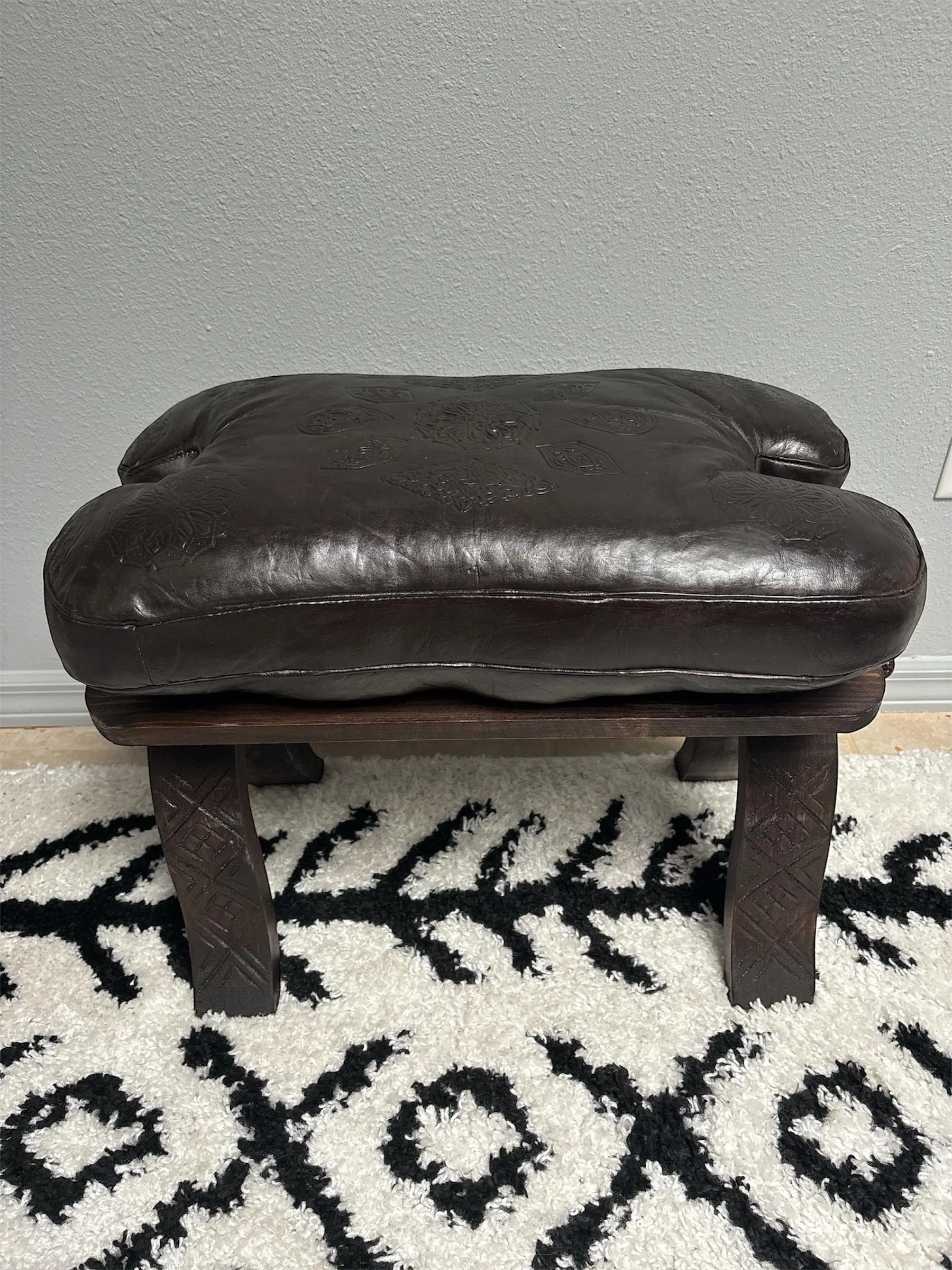 Handcrafted Moroccan Camel Saddle Stool: Black Leather Ottoman