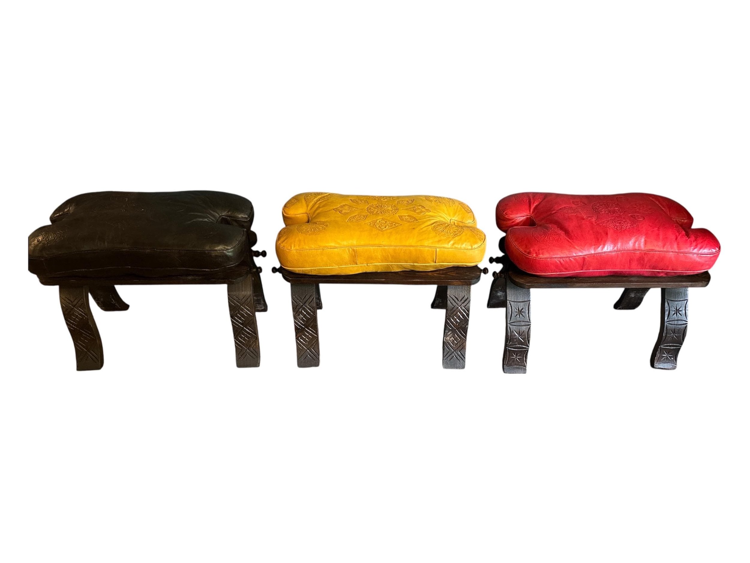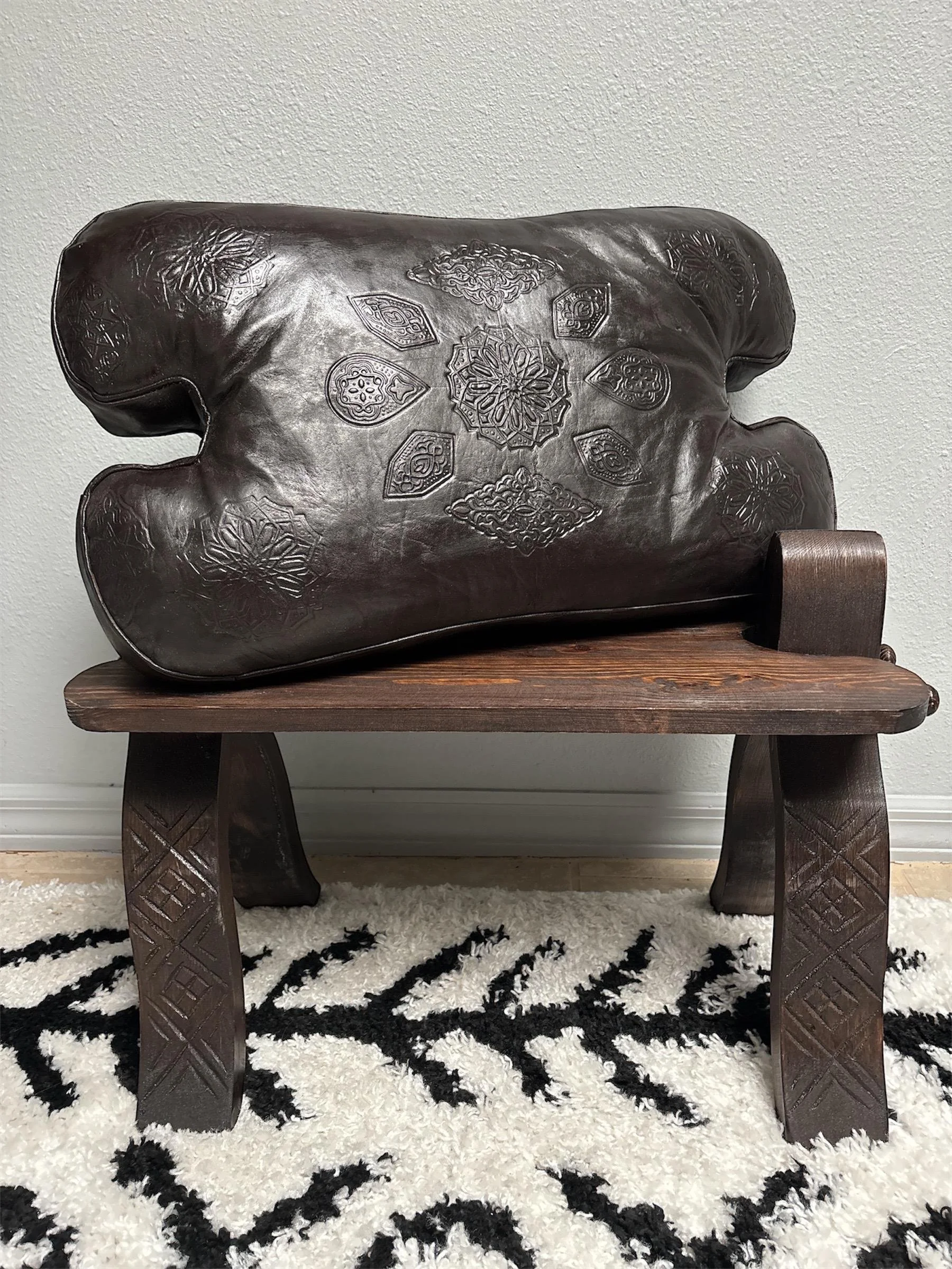 Handcrafted Moroccan Camel Saddle Stool with Detailed Leather Cushion in Black