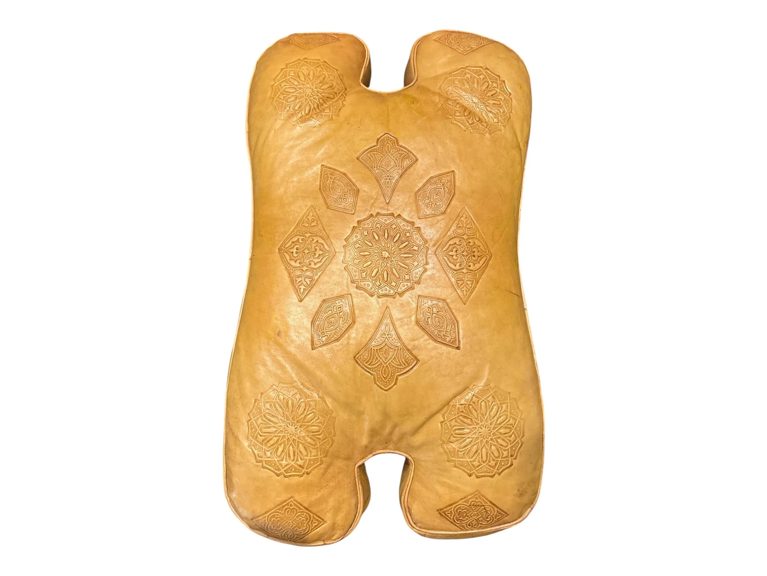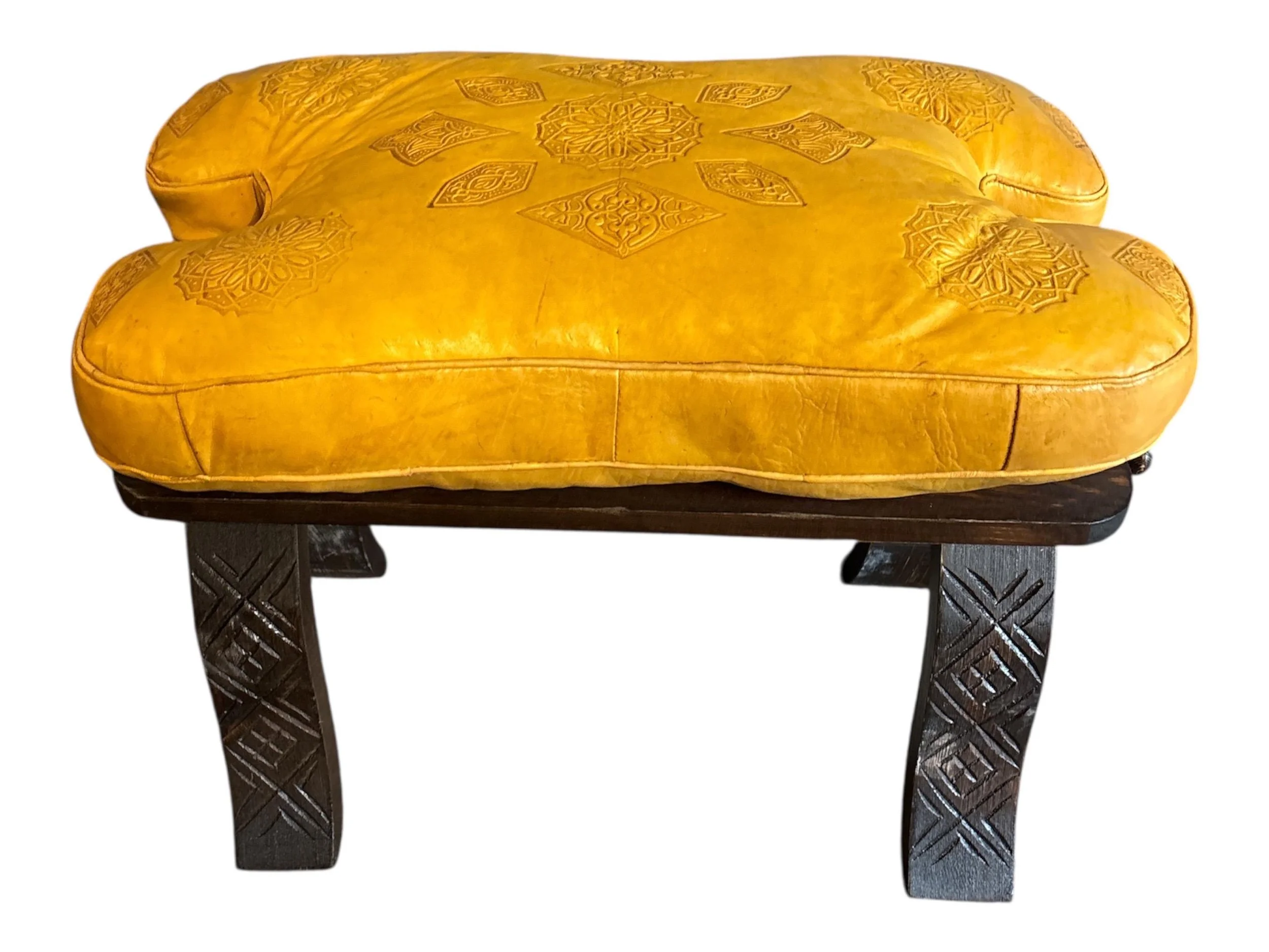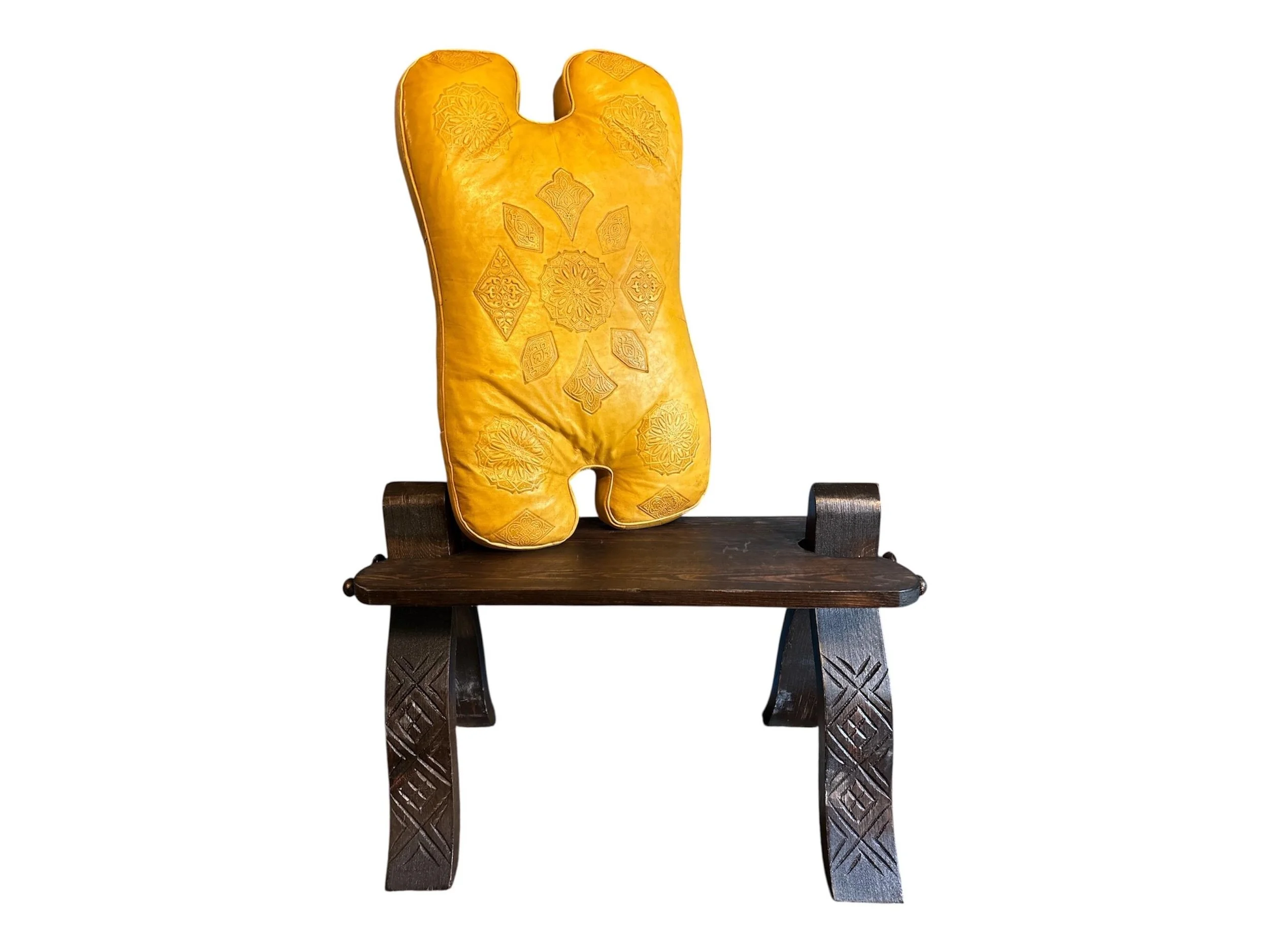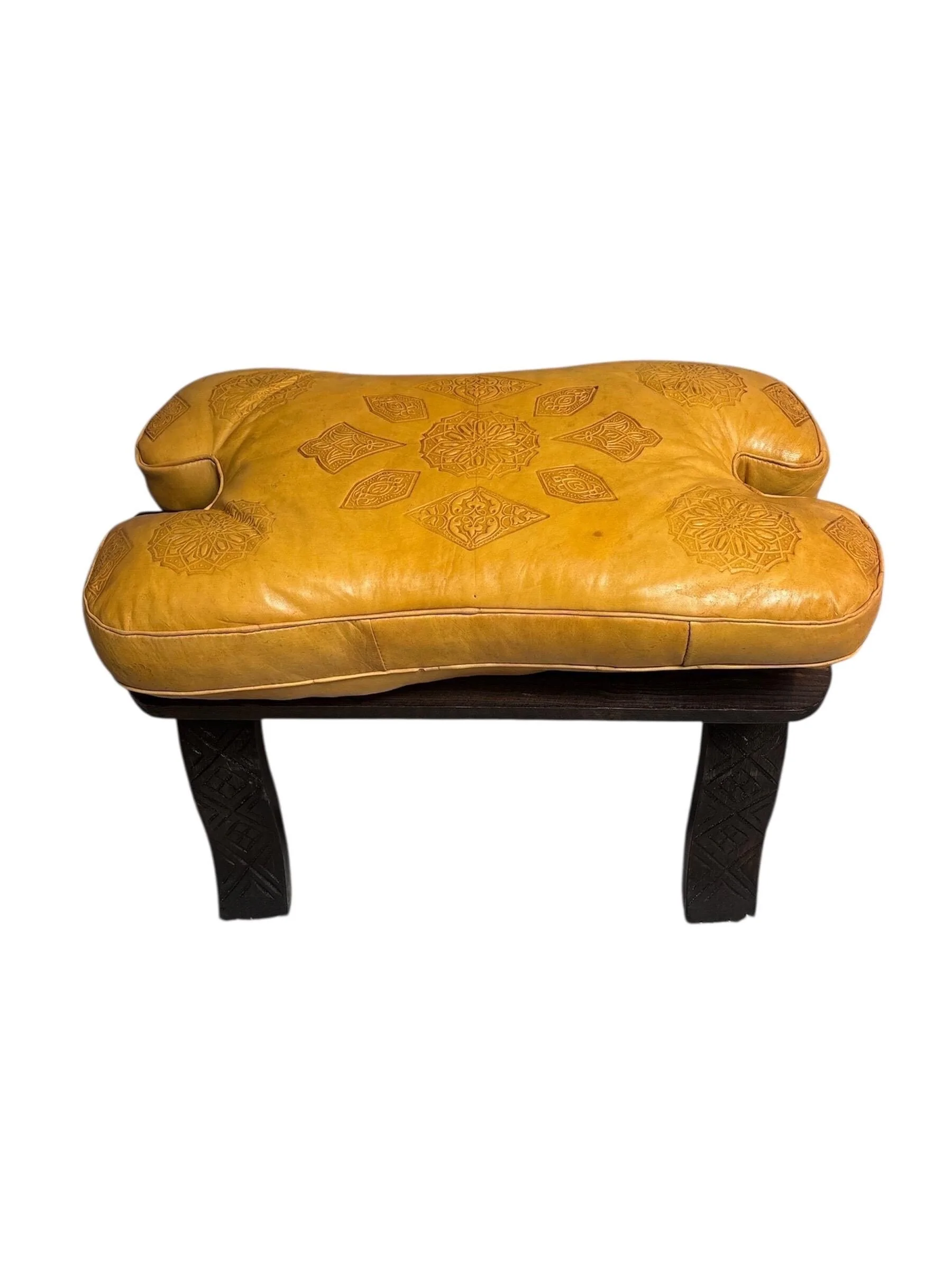Handcrafted Moroccan Camel Saddle Stool with Detailed Leather Cushion in Yellow