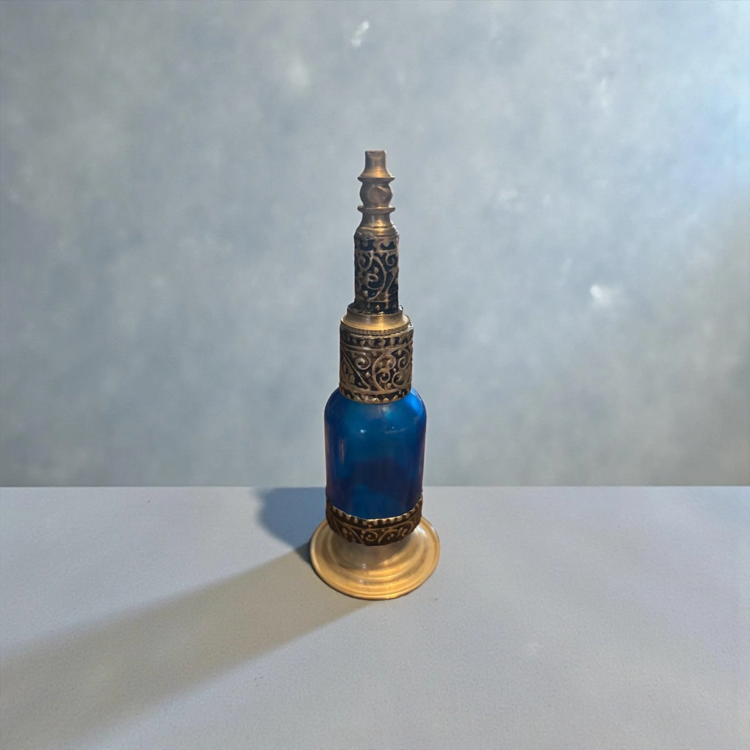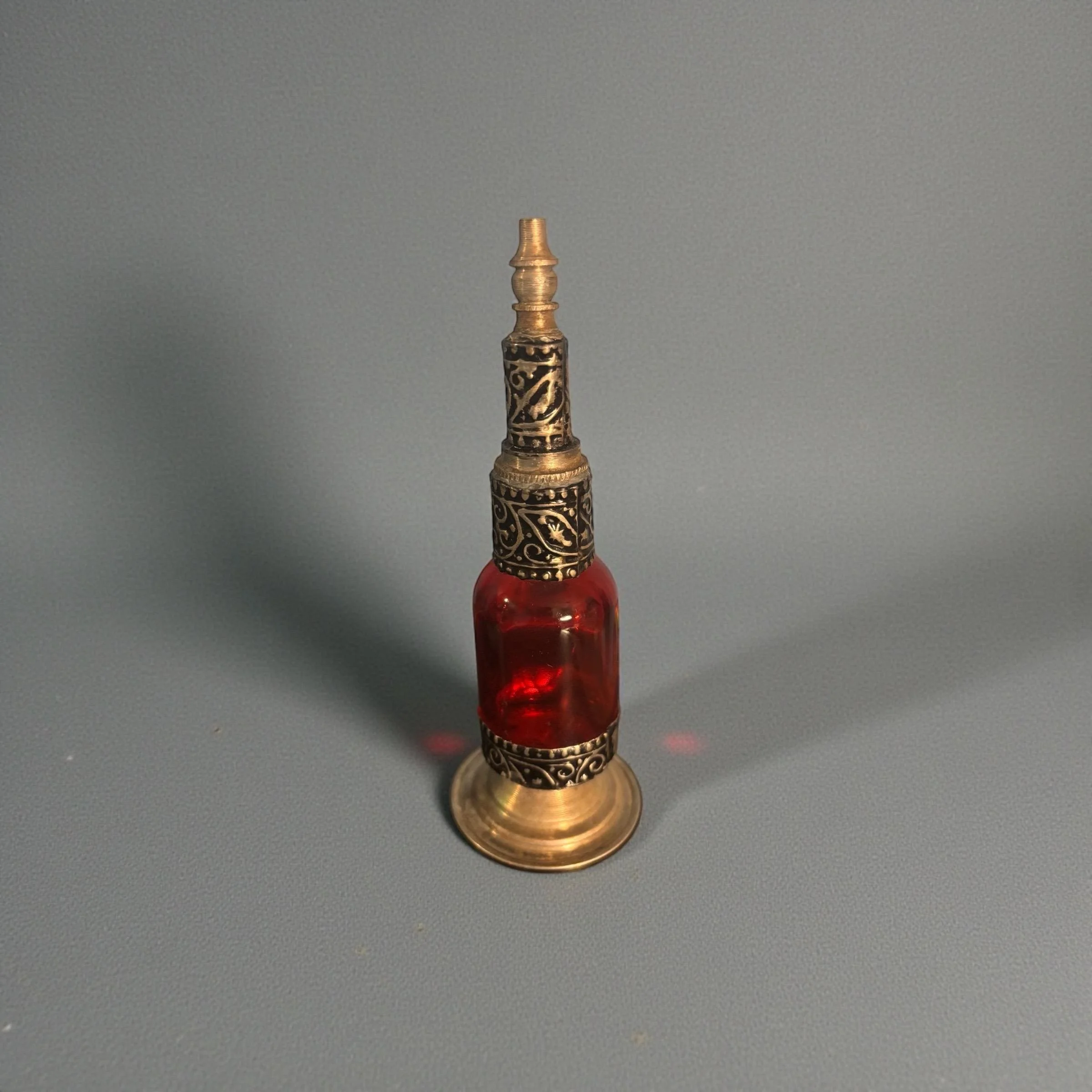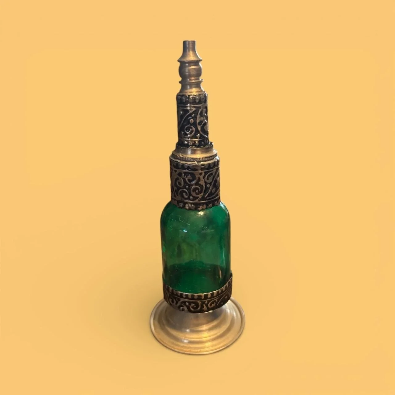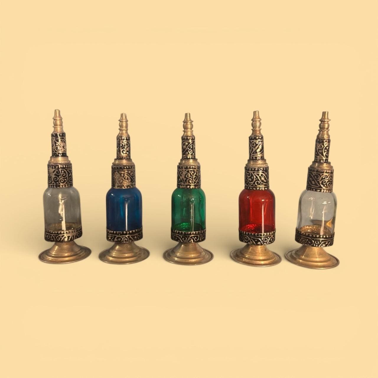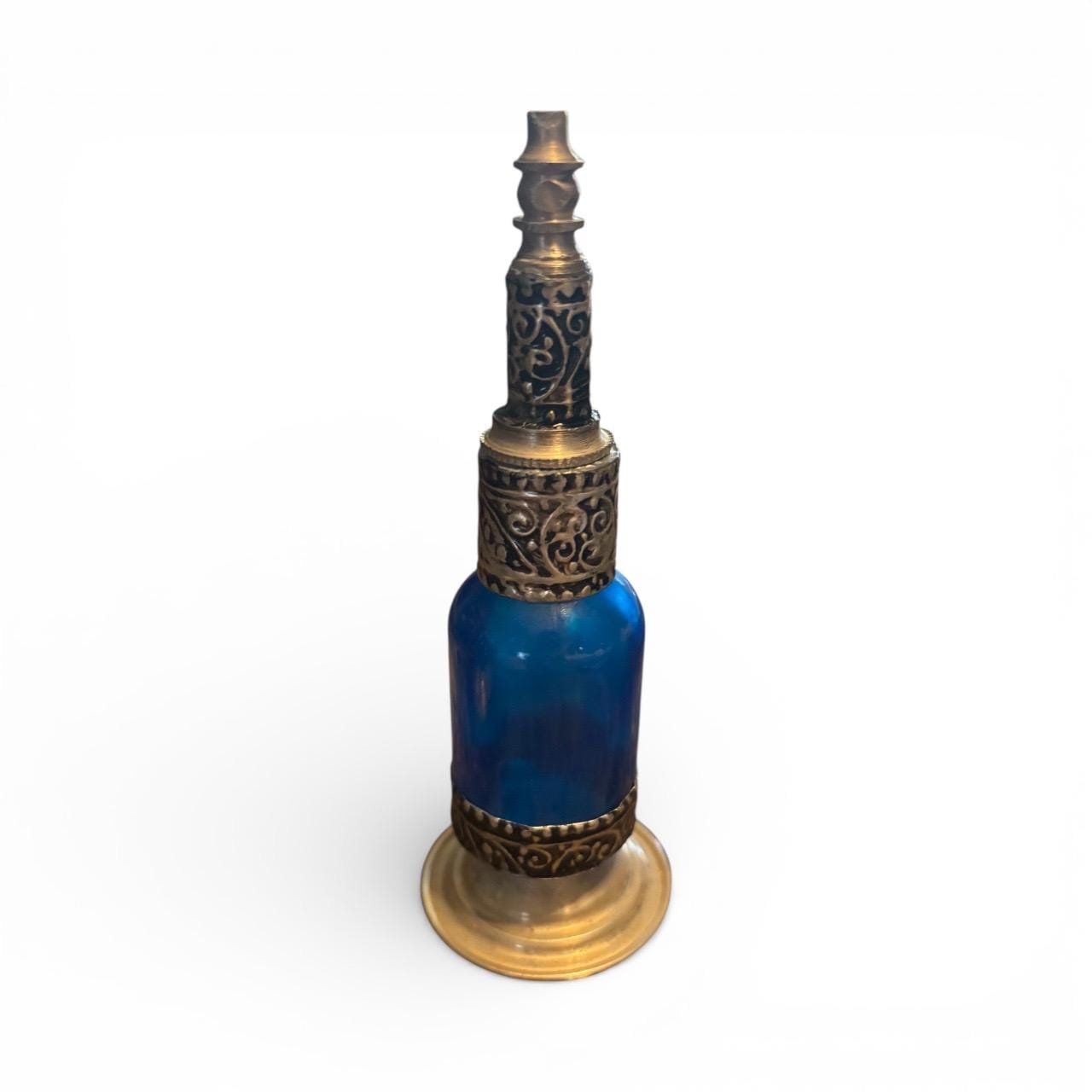 Each piece is a testament to the skill and dedication of the artisans, ensuring that no two bottles are exactly alike. Perfect for displaying perfumes, essential oils, or simply as a decorative art piece, this handmade Moroccan bottle brings a touch of exotic charm and elegance to your space.
