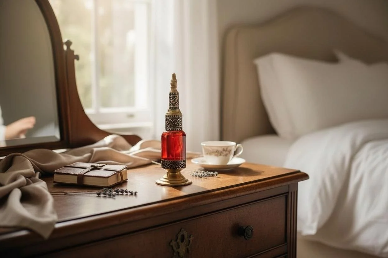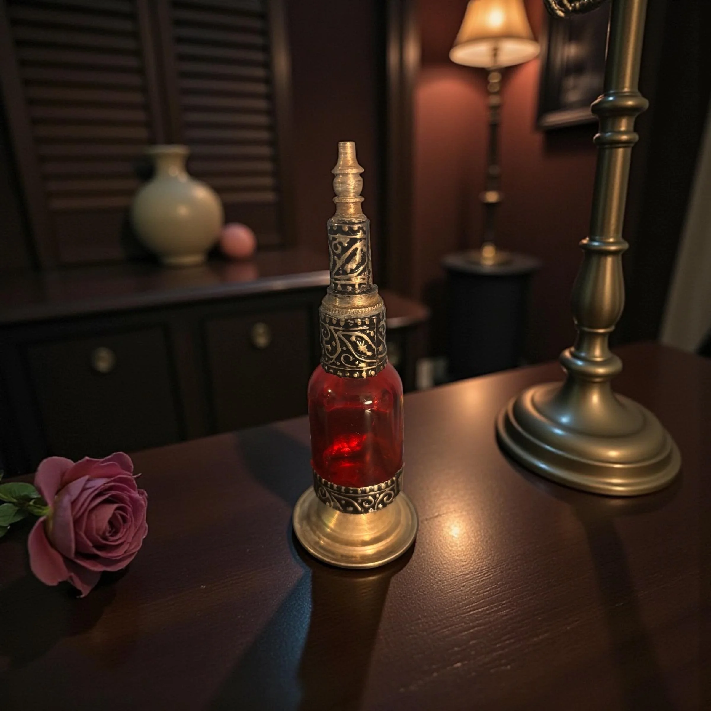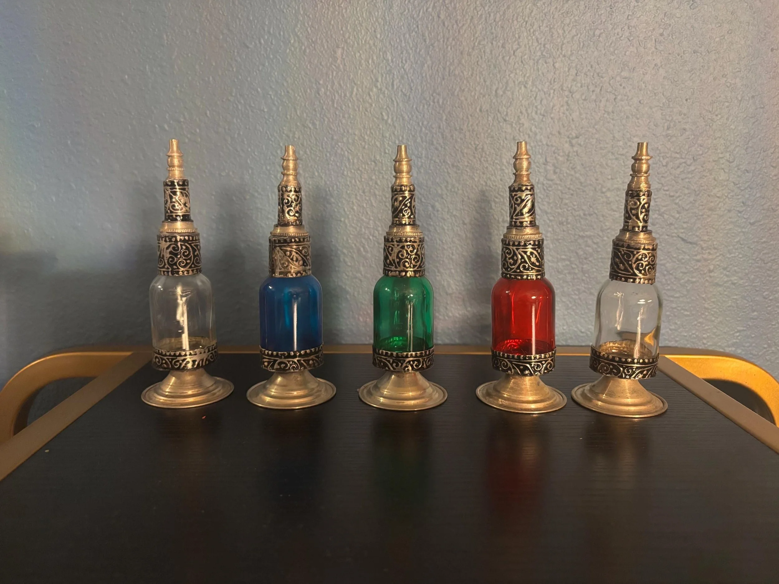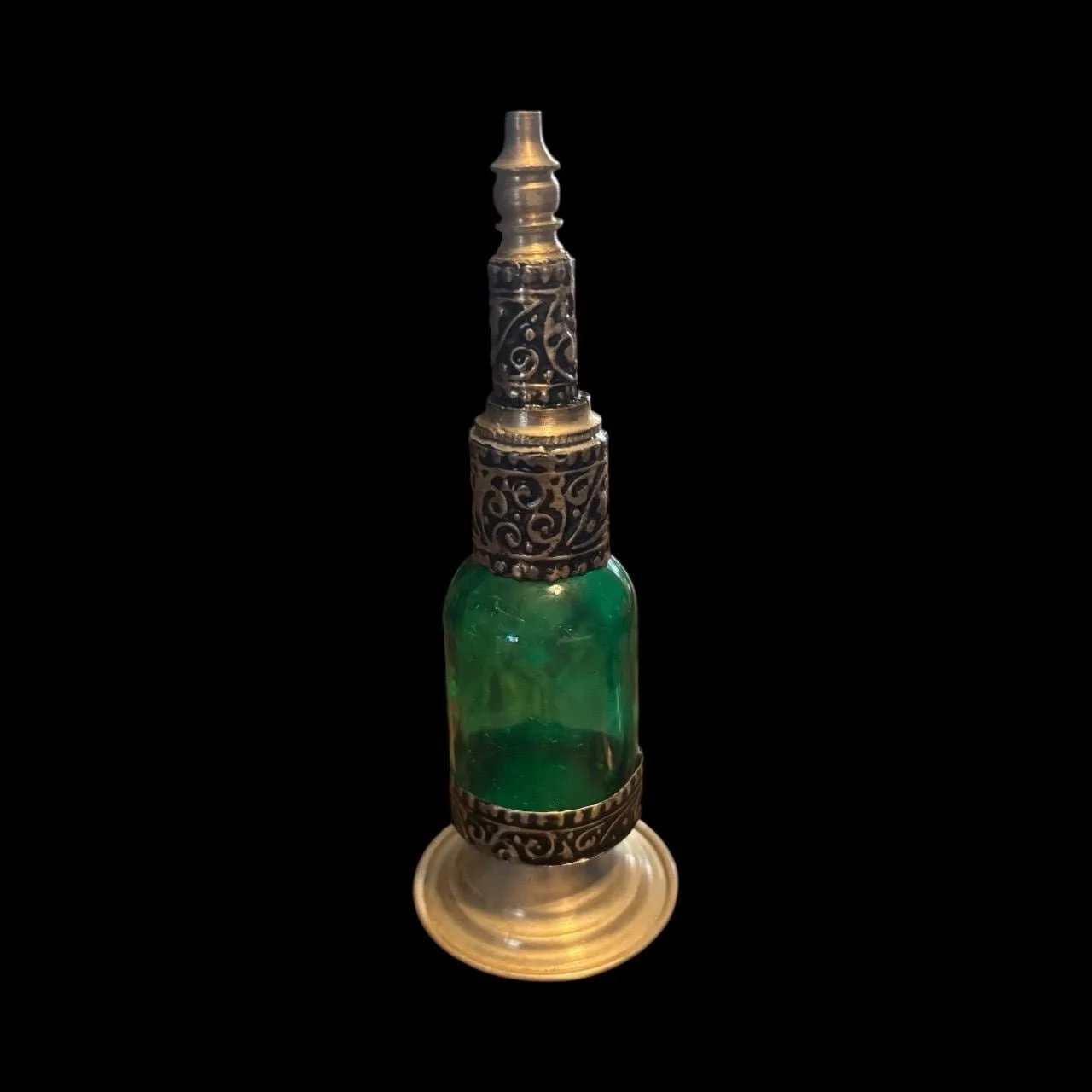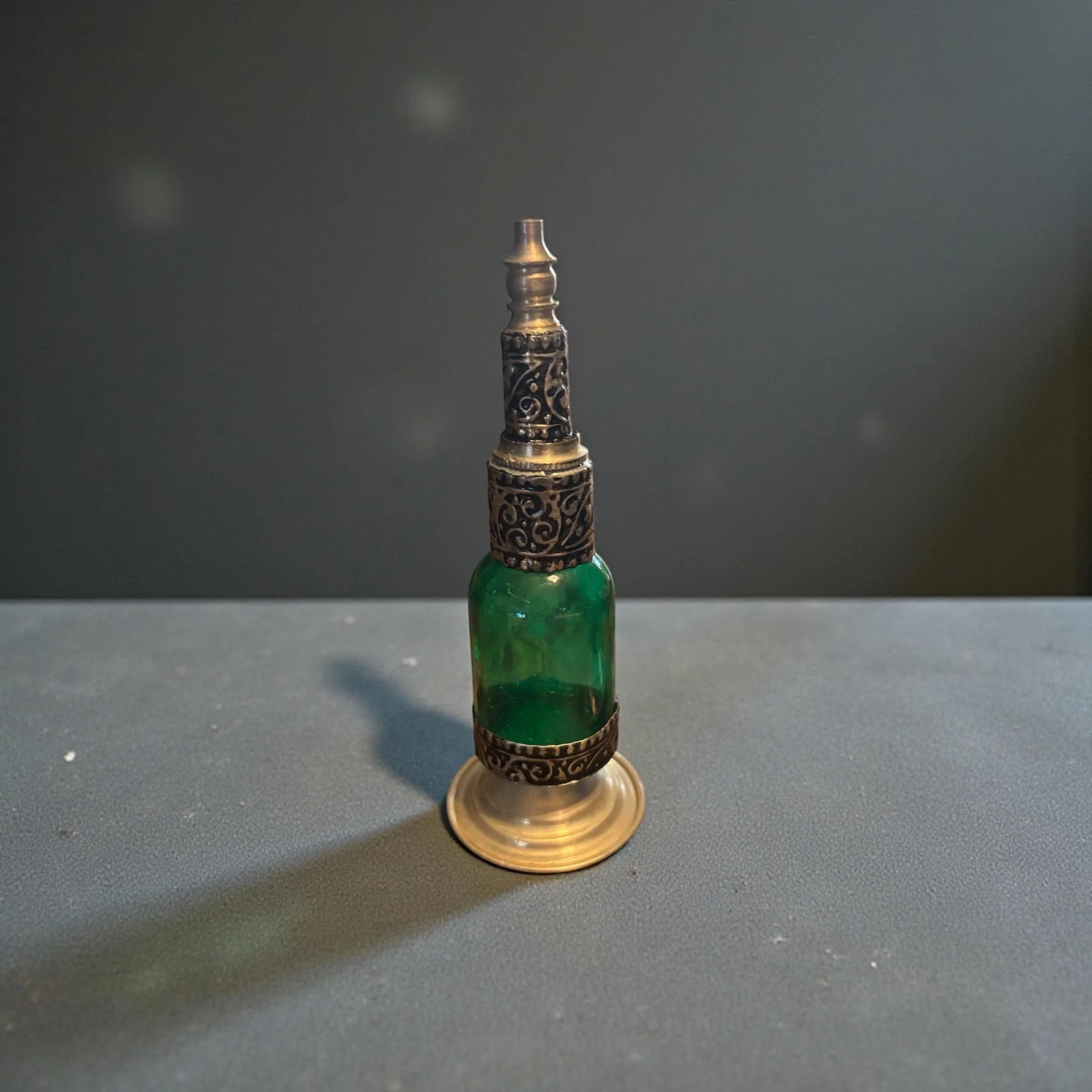 Each piece is a testament to the skill and dedication of the artisans, ensuring that no two bottles are exactly alike. Perfect for displaying perfumes, essential oils, or simply as a decorative art piece, this handmade Moroccan bottle brings a touch of exotic charm and elegance to your space.