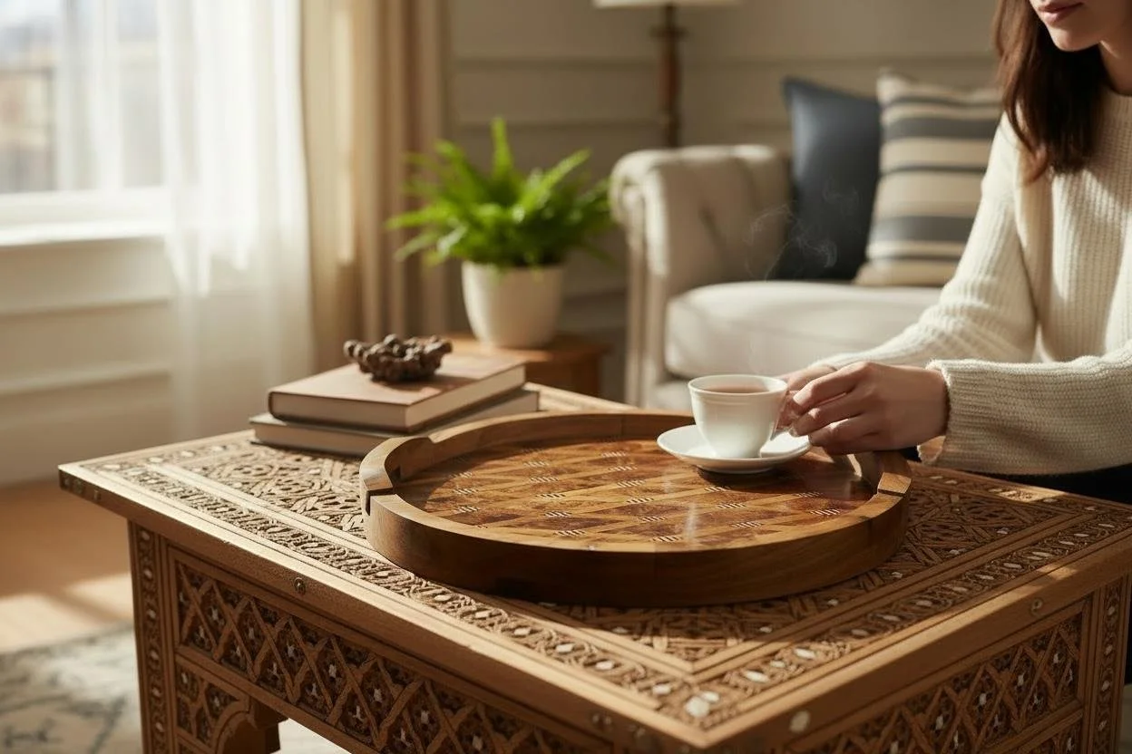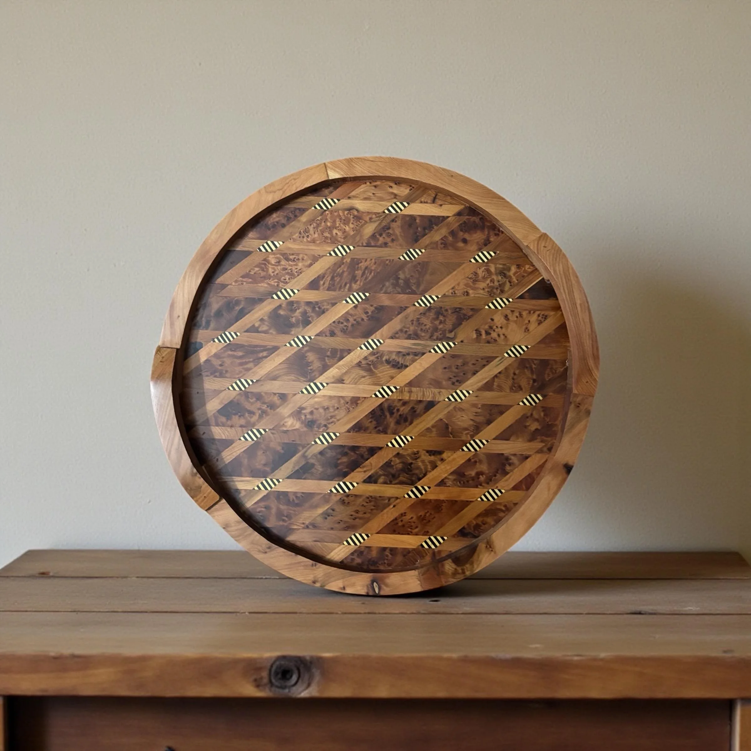 Handmade Moroccan Thuya Burl Wood Round Marquetry Serving Tray