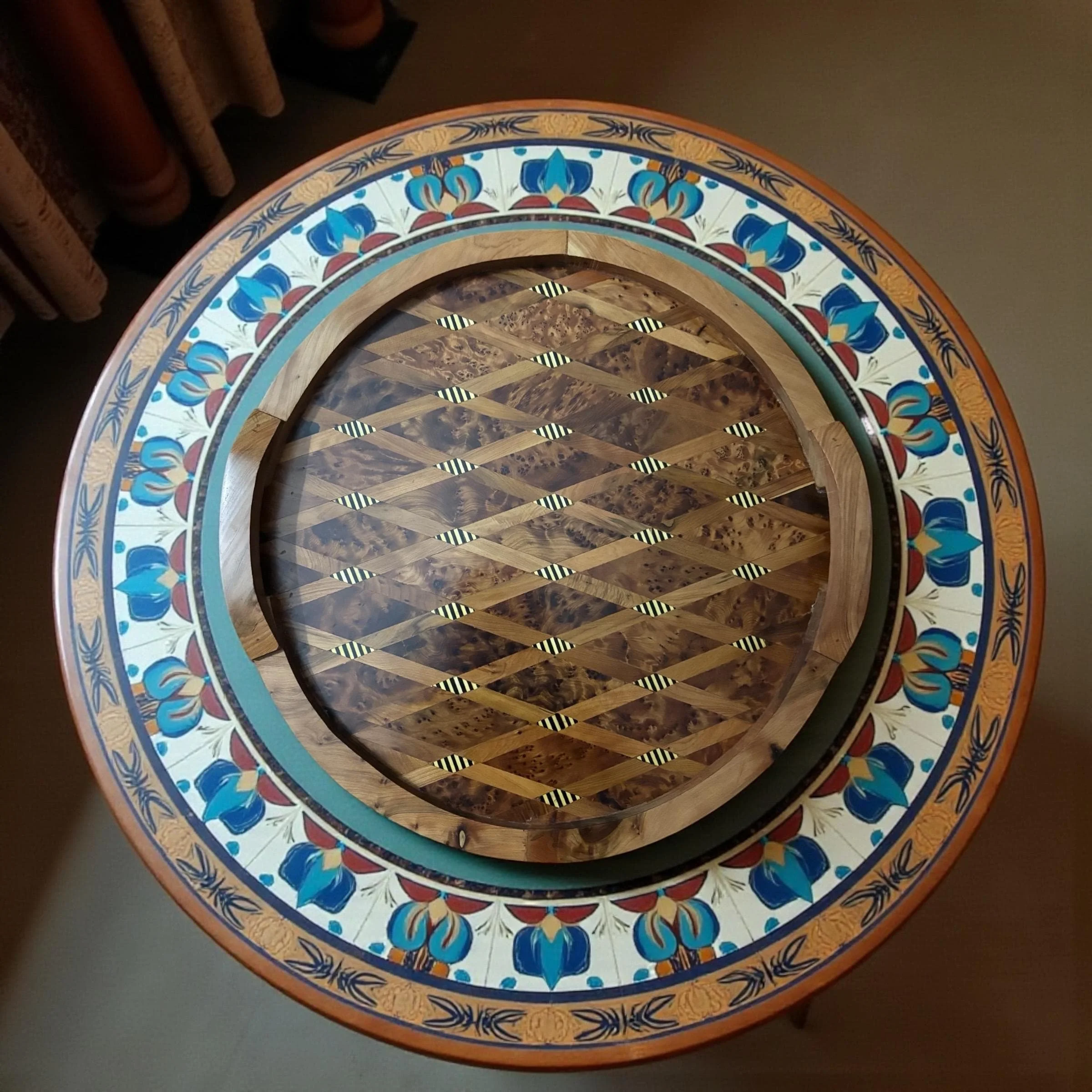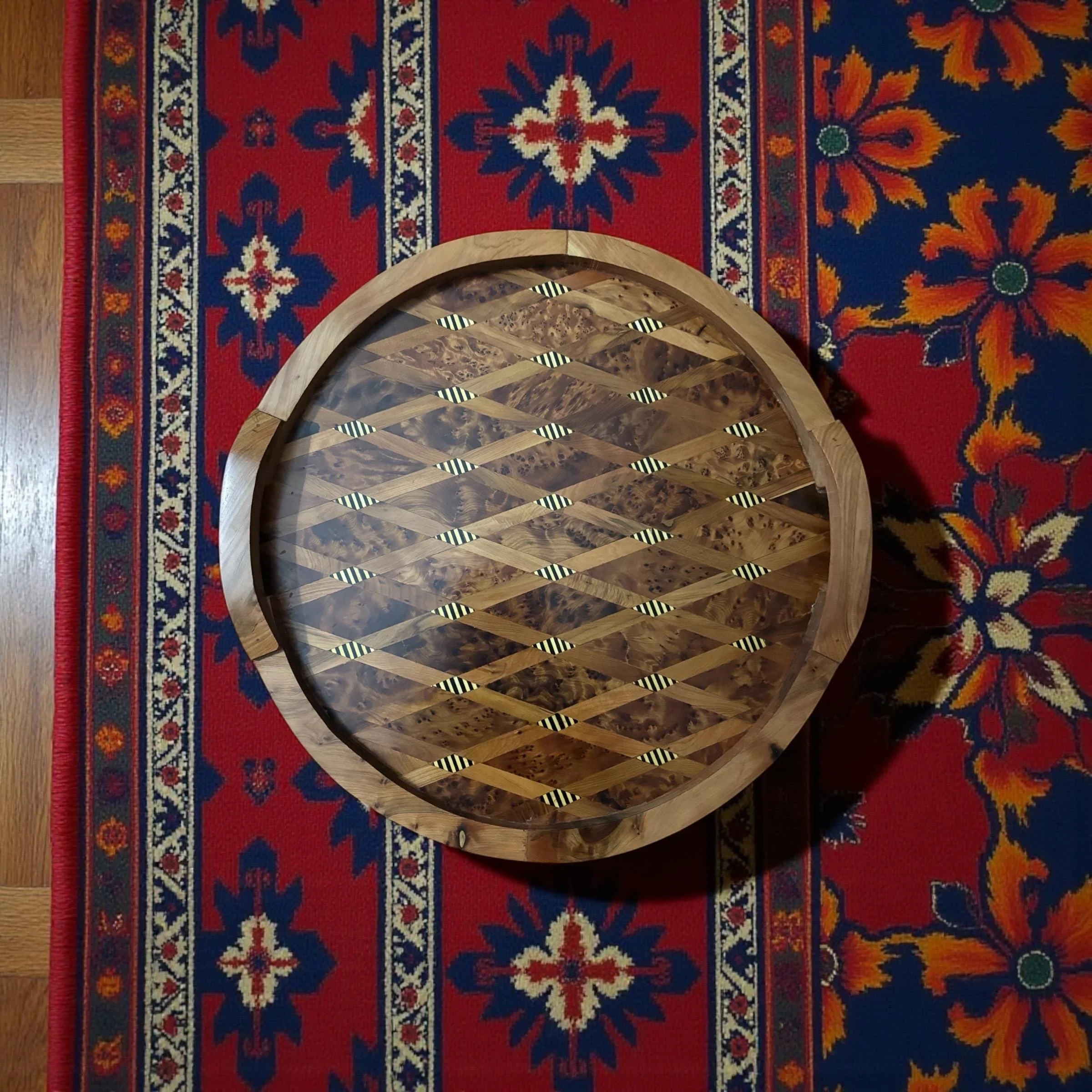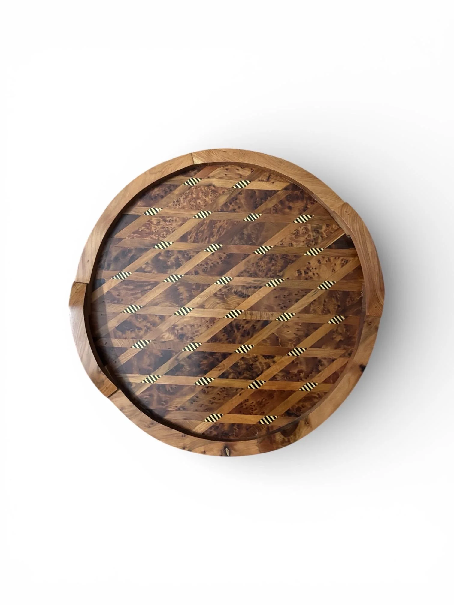 Beautiful round tray crafted in Morocco from aromatic Thuya burl wood, featuring intricate lattice marquetry with contrasting inlays. Ideal as a coffee or tea serving tray or as a decorative centerpiece on a table or ottoman. The natural burl figuring and hand-finished glossy surface make this a one-of-a-kind artisan piece and a distinctive Moroccan décor accent.