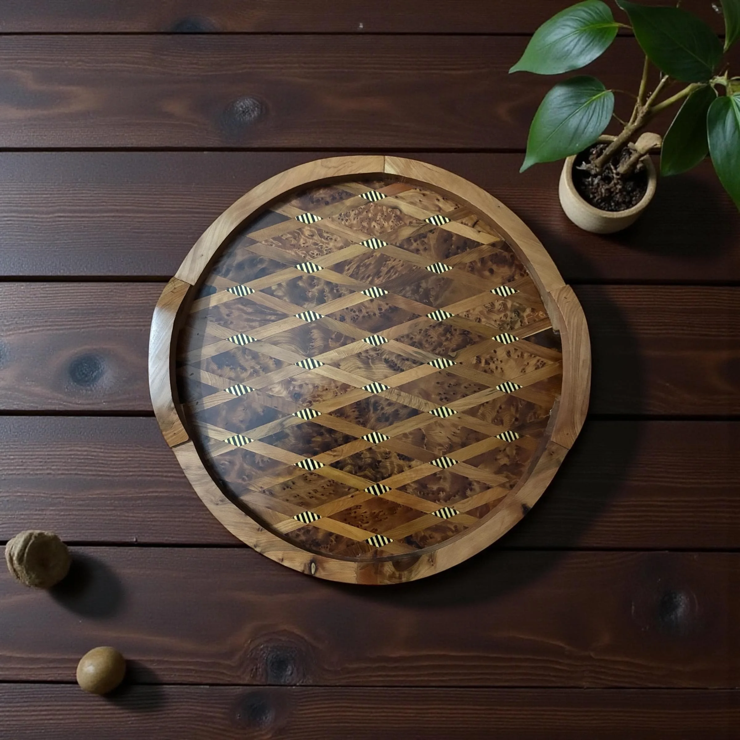 The diamond lattice pattern with small striped inlay pieces is typical of Moroccan artisan trays, making each piece unique because the burl figure varies from tray to tray.