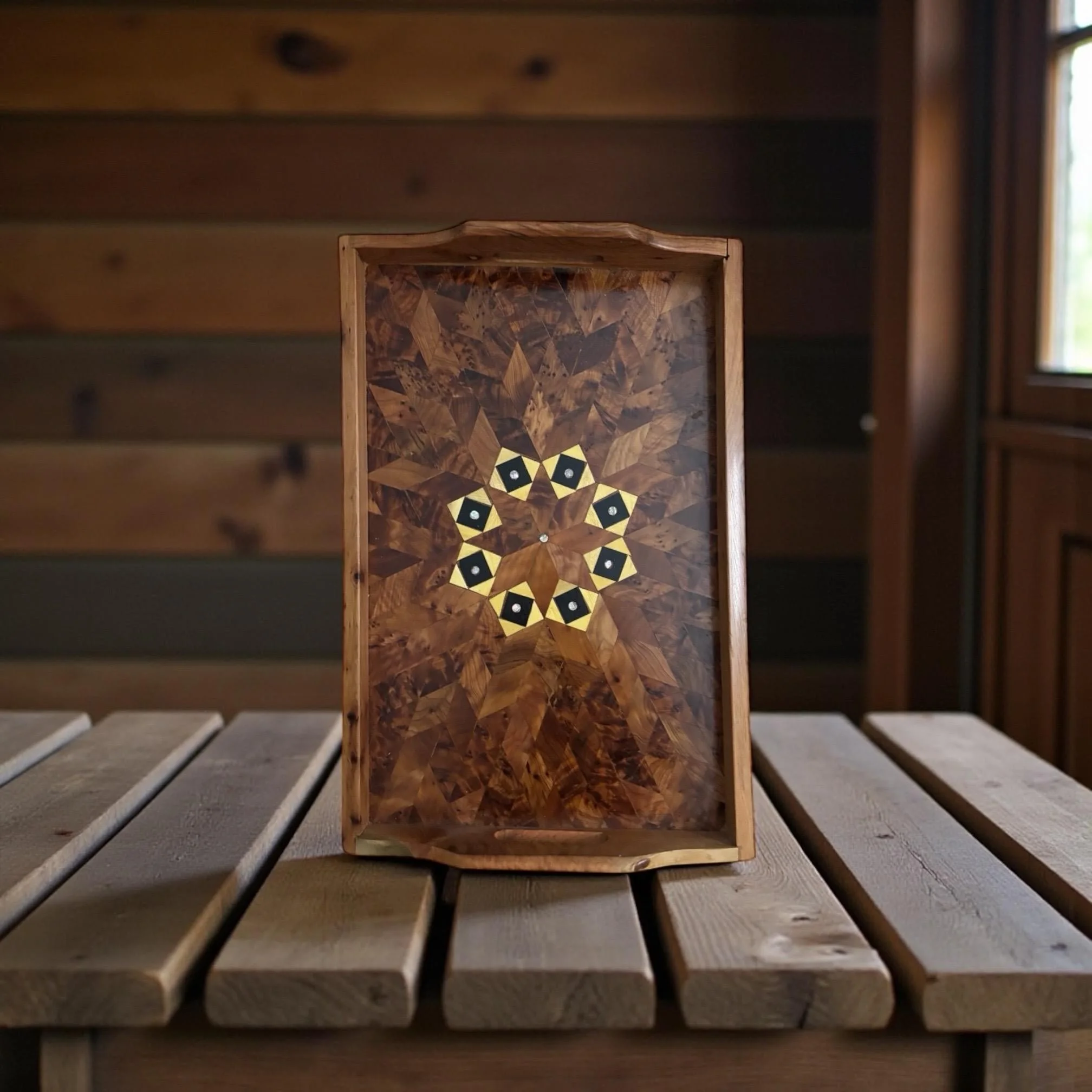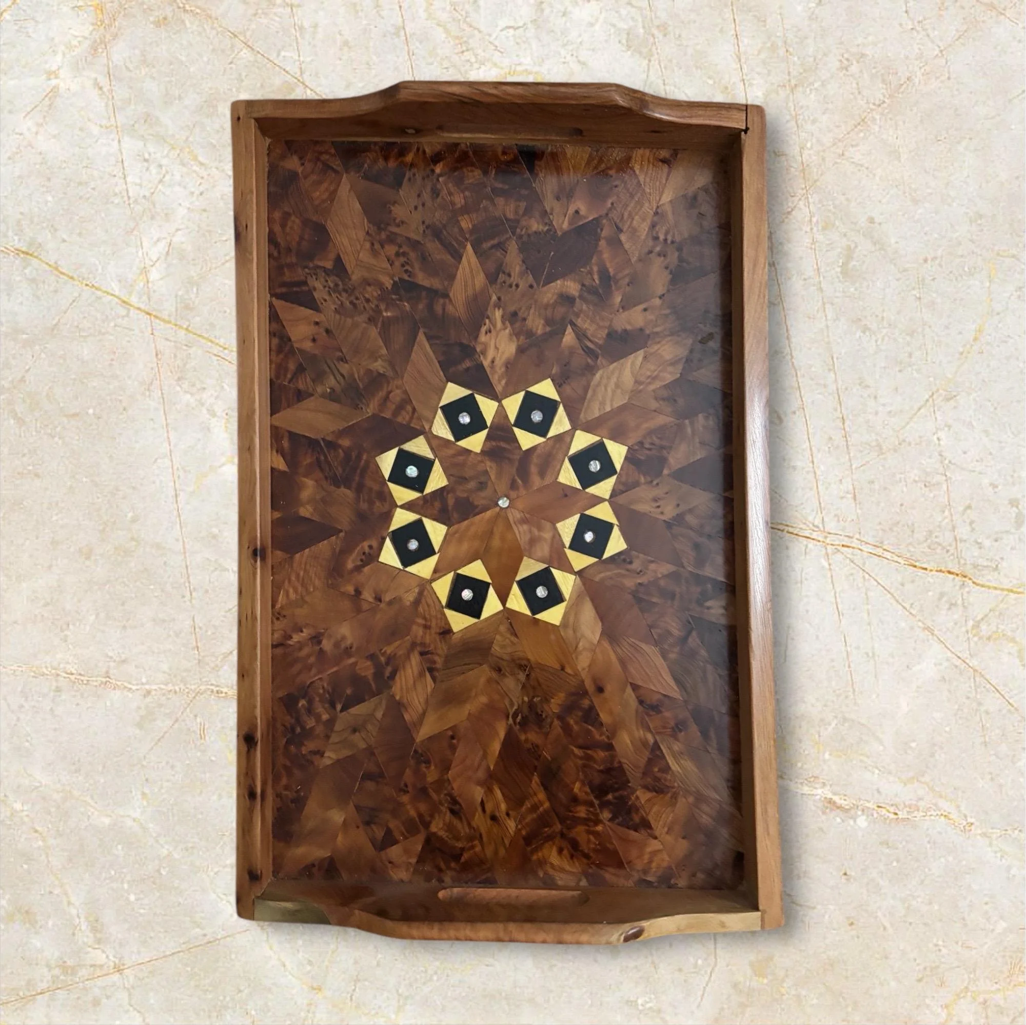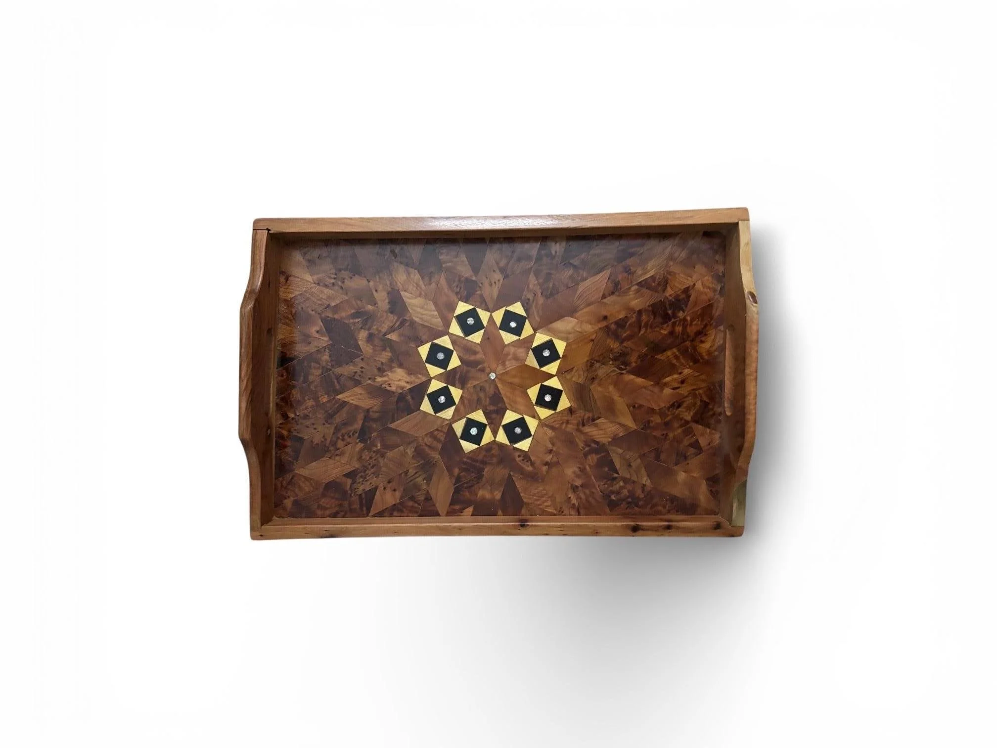 The diamond lattice pattern with small striped inlay pieces is typical of Moroccan artisan trays, making each piece unique because the burl figure varies from tray to tray.
