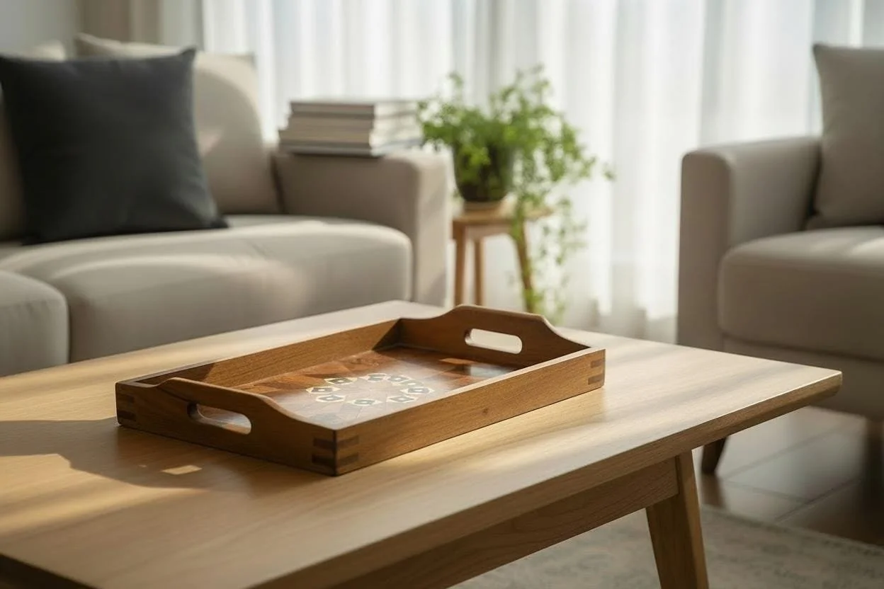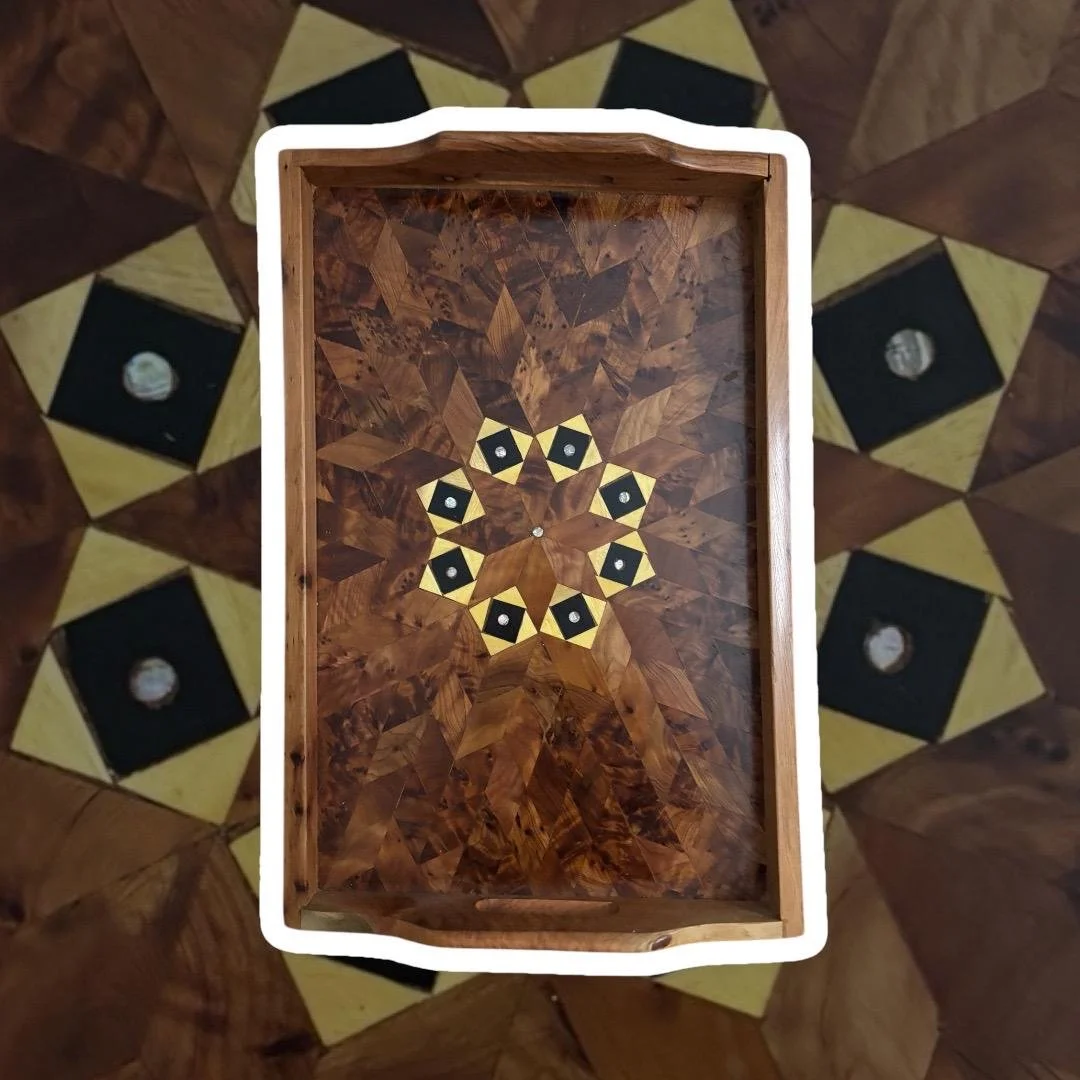 Crafted from Thuya burl with contrasting lighter inlay strips, often combined with lemon wood and sometimes ebony in Moroccan marquetry work.