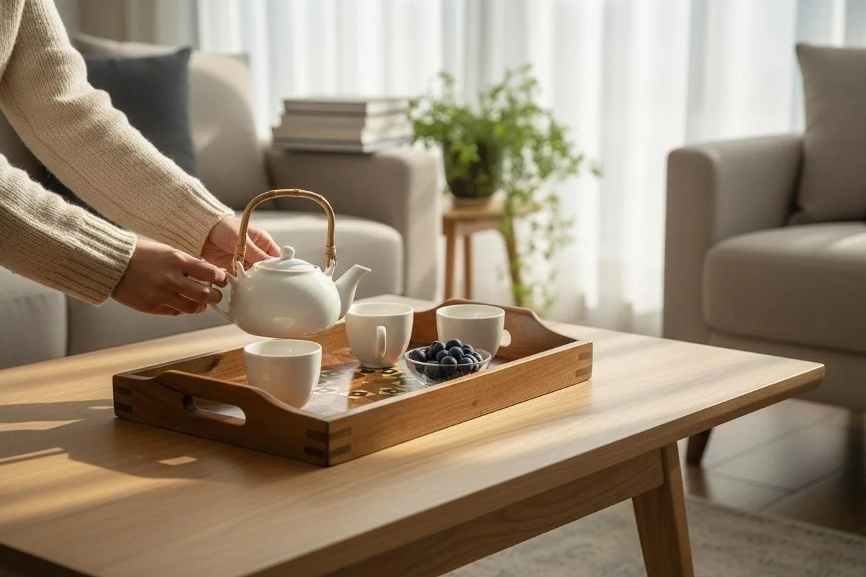 Beautiful round tray crafted in Morocco from aromatic Thuya burl wood, featuring intricate lattice marquetry with contrasting inlays. Ideal as a coffee or tea serving tray or as a decorative centerpiece on a table or ottoman. The natural burl figuring and hand-finished glossy surface make this a one-of-a-kind artisan piece and a distinctive Moroccan décor accent.